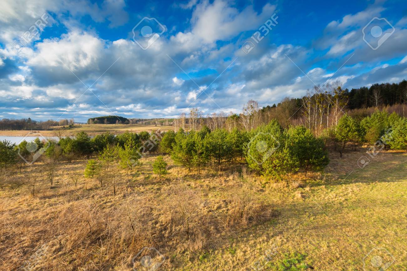 Schone Landschaft Von Oben Fotografiert Von Hohen Aussichtsturm Fruhen Fruhling Wiese Mit Wald Unter Blauen Himmel Mit Wolken Ruhige Szene Lizenzfreie Fotos Bilder Und Stock Fotografie Image 38341082