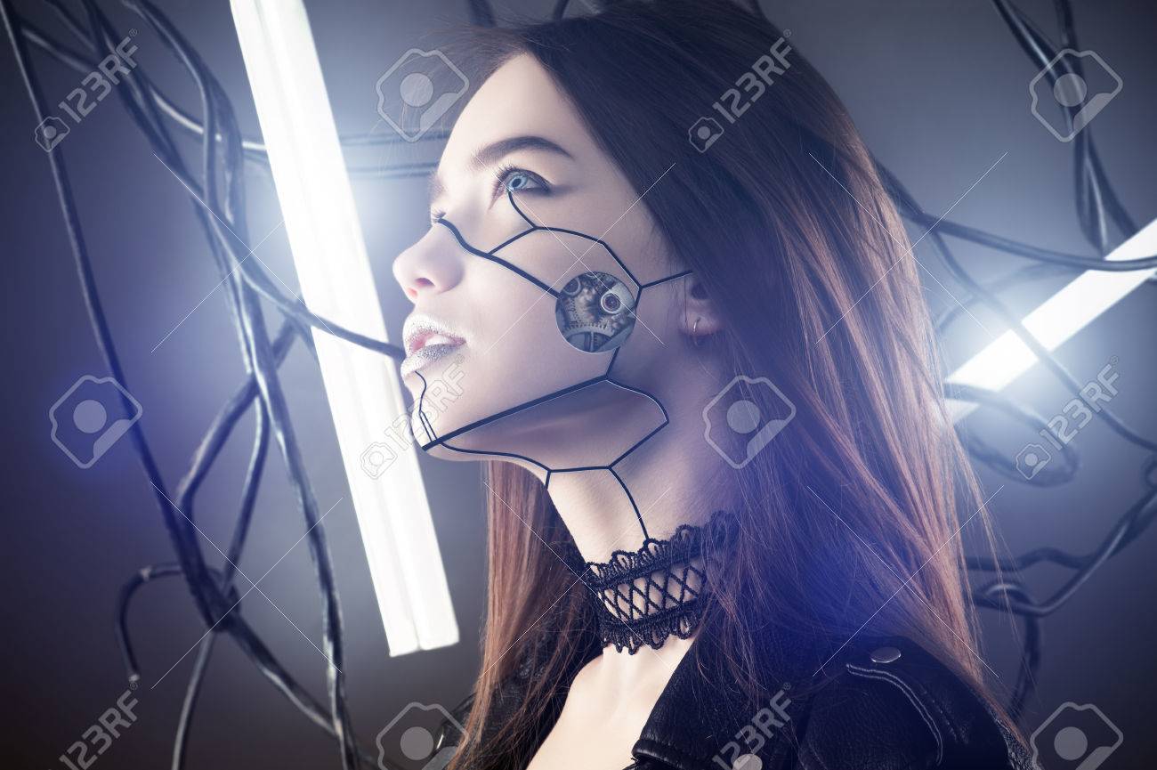 Schone Roboter Madchen In Cyberpunk Stil Blick Auf Hintergrund Der Drahte Und Leuchtenden Lampen Lizenzfreie Fotos Bilder Und Stock Fotografie Image 81293578
